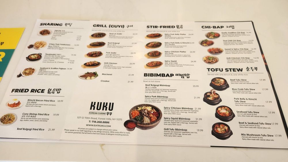 With attentive staff, a full bar, and a diverse drink menu including exotic cocktails, Kuku invites you to indulge in a delightful dining experience that celebrates the essence of Korean food.
