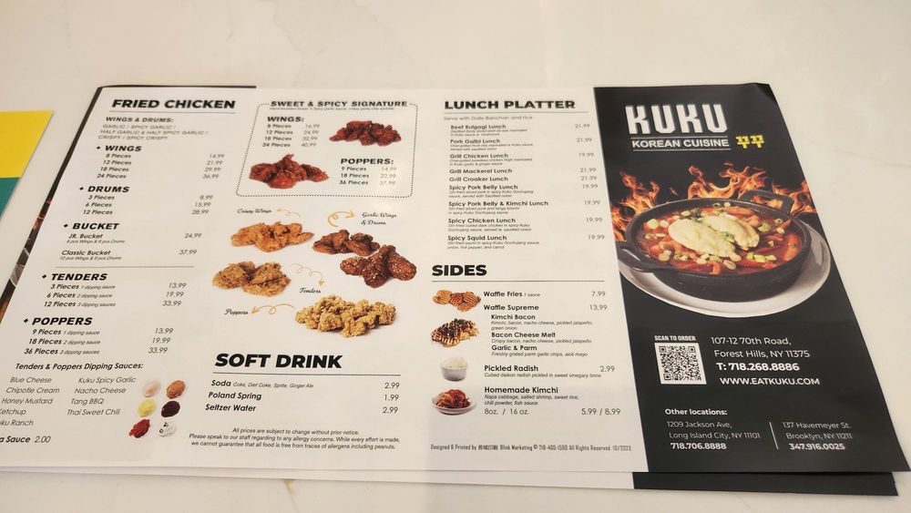 Welcome to Kuku Korean Cuisine - Forest Hills, where the vibrant flavors of Korean cuisine come alive in a casual, trendy setting. Nestled at 107-12 70th Rd, this gem emphasizes Korean dishes, particularly their renowned chicken wings, served perfectly crispy and spicy. Guests rave about the kimchi, which is so delightful that many order extra to savor at home.