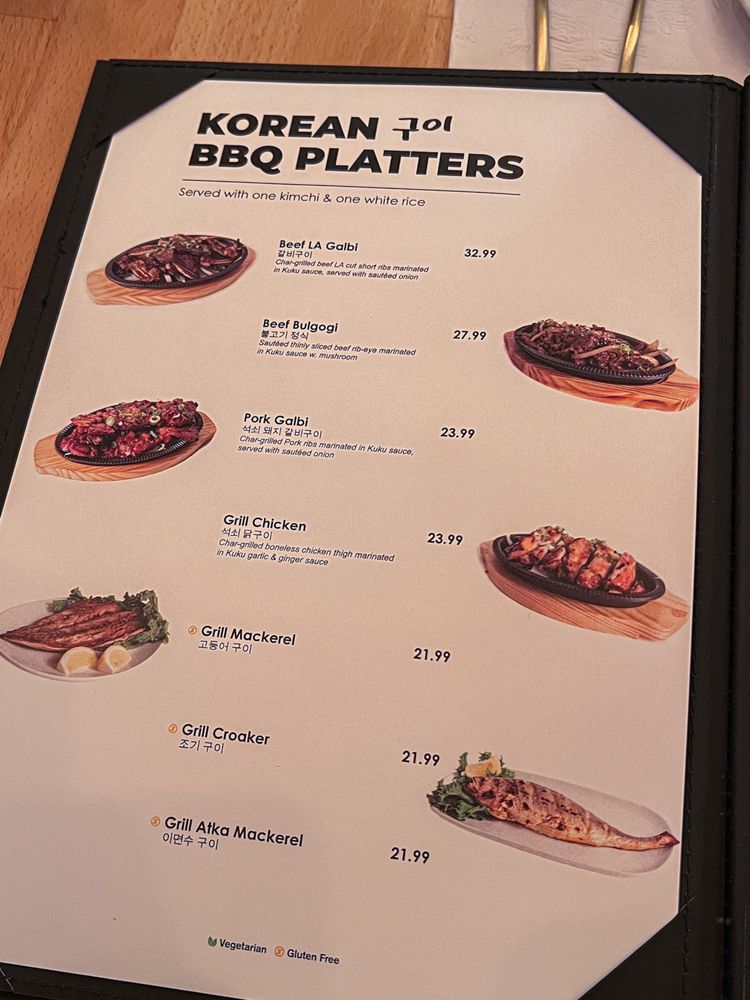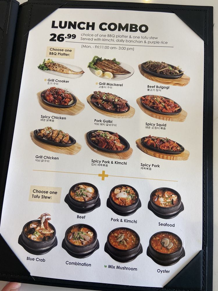 Choice of one BBQ platter one chilled noodle or tofu stew Served with Kimchi, daily banchan purple rice